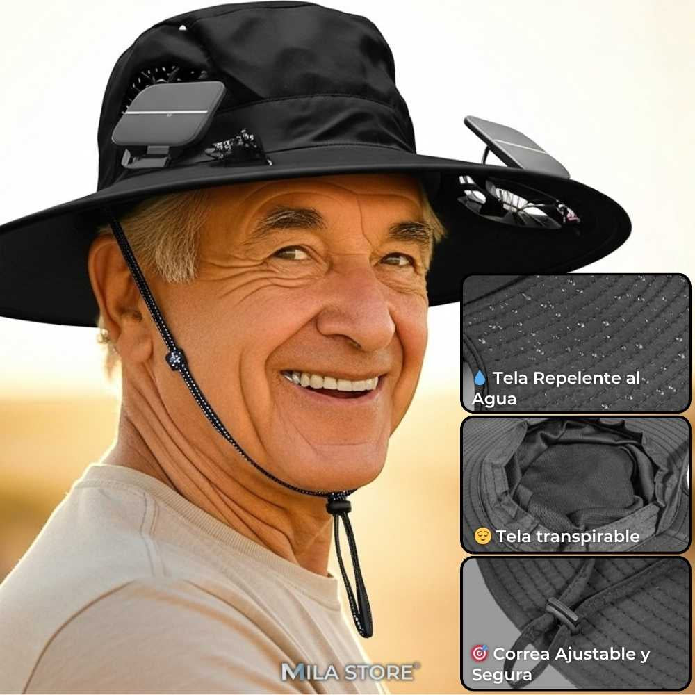 Sí ✅. Su doble ventilador solar genera una brisa constante que reduce la sensación térmica incluso bajo el sol fuerte. En segundos sentirás el alivio.