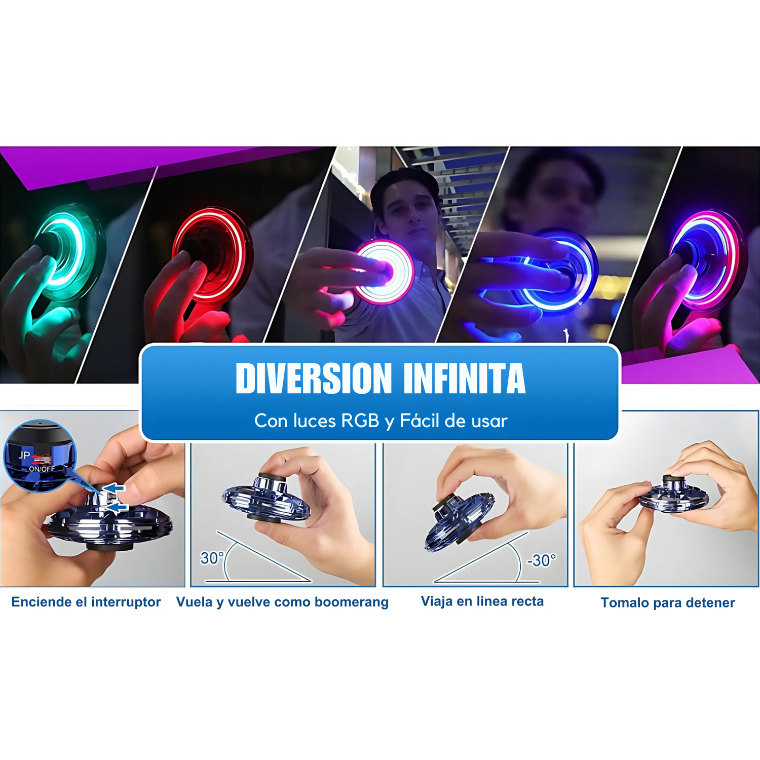 🌀 Gira, vuela, vuelve como un boomerang y se detiene al tocar tu mano.