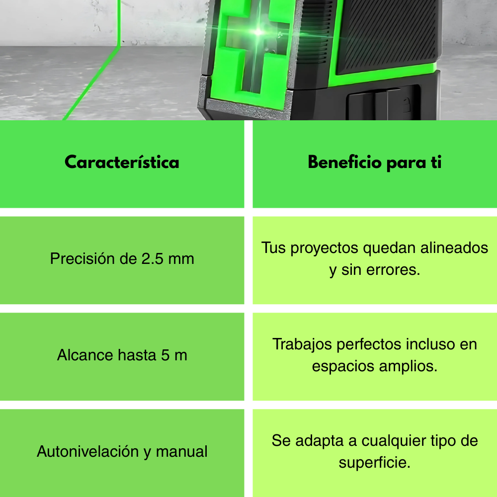 LaserPro™ emite dos líneas verdes brillantes y visibles hasta 5 metros, ideales para paredes, pisos, muebles o estructuras.