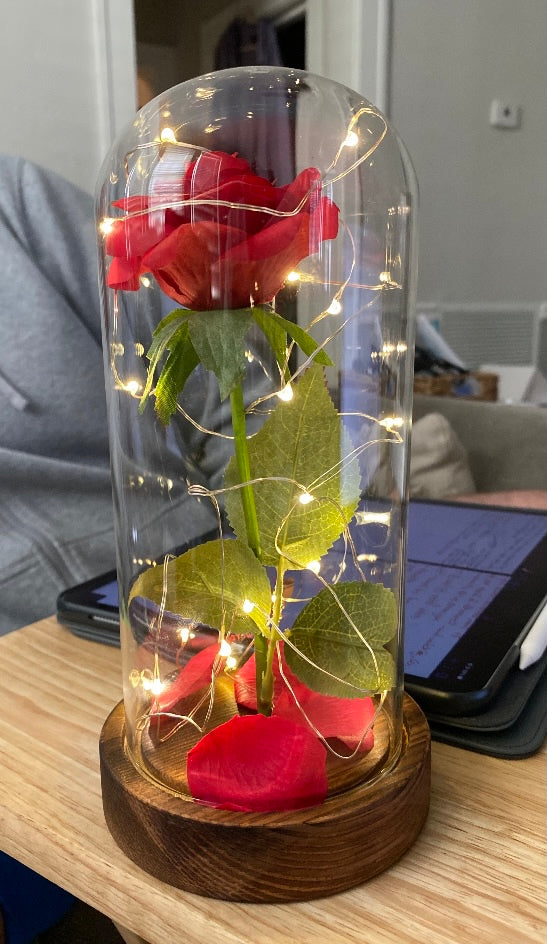 - ✨ Diseño: Base resistente y cúpula sellada para proteger la rosa y mantener su frescura.